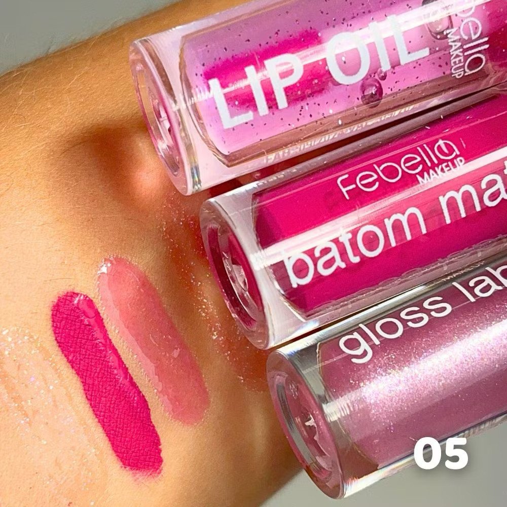 Contém: 01 Unidade de Batom Matte Cor 05, 01 Unidade de Gloss Cor 05 e 01 Unidade de Lip Oil Cor 05